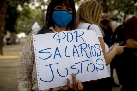 Decenas de docentes venezolanos protestaron este miércoles ante el Ministerio de Educación, en Caracas, para exigir el «pago completo» del bono vacacional y de otros beneficios que, denuncian, fueron reducidos recientemente.