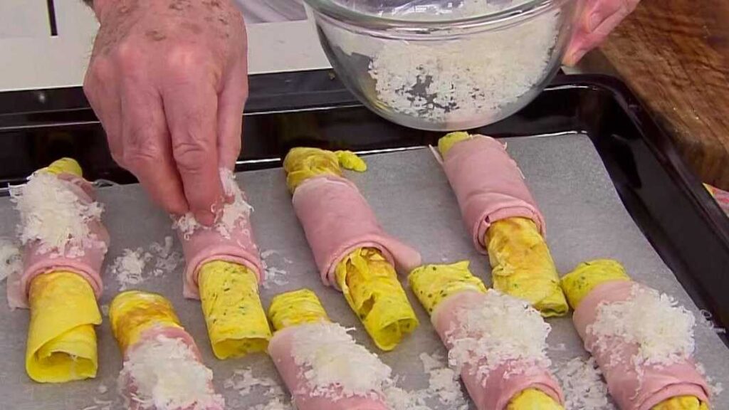4-Dobla la loncha de jamón por la mitad y procede a envolver la tortilla con ella. Sitúa el rollito sobre una bandeja de horno cubierta con papel de horno. Finalmente, repite el proceso con el resto de los ingredientes.