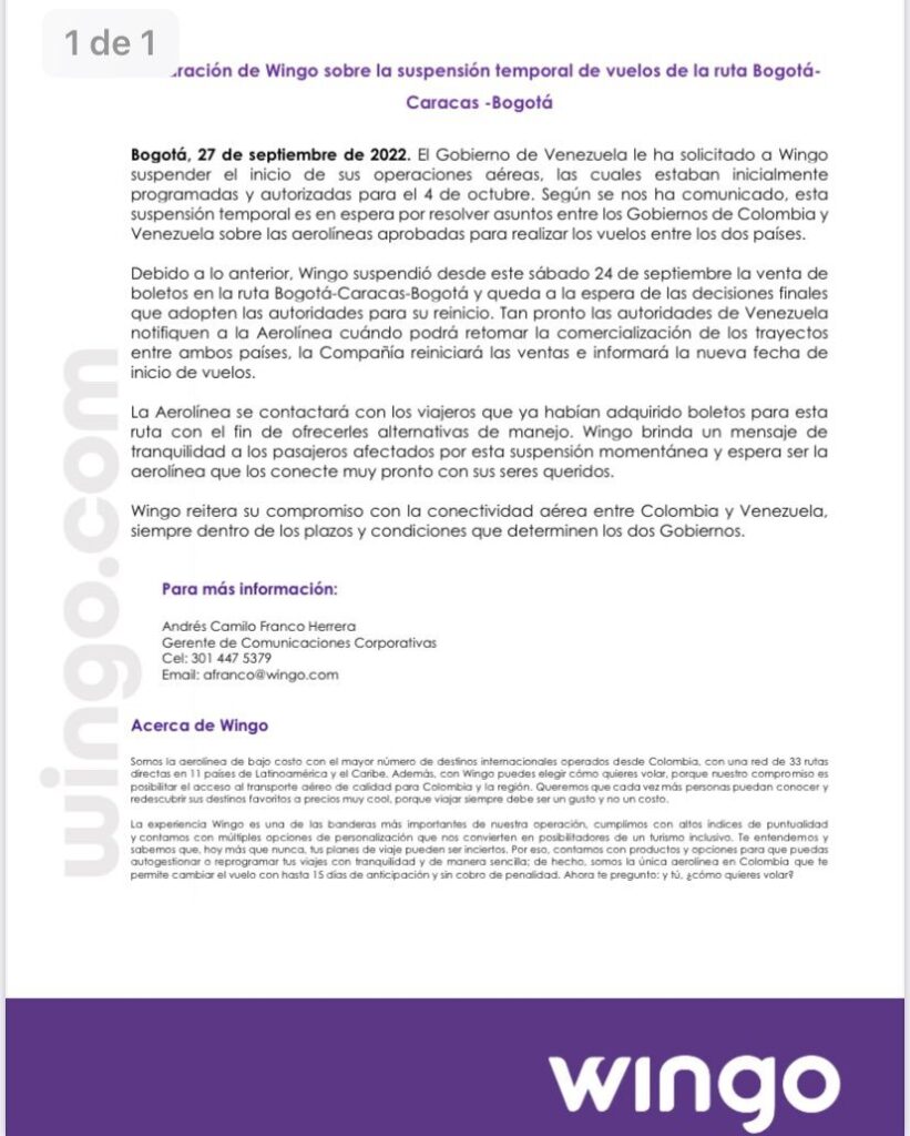 “Wingo brinda un mensaje de tranquilidad a los pasajeros afectados por esta suspensión momentánea y espera ser la aerolínea que los conecte muy pronto con sus seres queridos. Wingo reitera su compromiso con la conectividad aérea entre Colombia y Venezuela, siempre dentro de los plazos y condiciones que determinen los dos Gobiernos”, destaca el documento.
