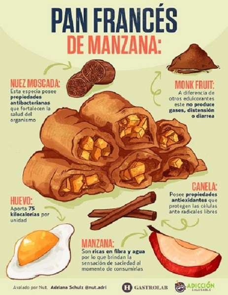 Además de ser una excelente opción para el desayuno este pan francés de manzana tiene excelentes propiedades nutritivas en sus ingredientes como la nuez moscada, especia que posee propiedades antibacterianas que fortalecen la salud del organismo; el monk fruit a diferencia de otros edulcorantes éste no produce gases, distensión o diarrea; el huevo aporta 75 kilocalorías por unidad; la manzana son ricas en fibra y agua por lo que brindan la sensación de saciedad al momento de consumirlas y la canela posee propiedades antioxidantes que protegen las células ante radicales libres.
