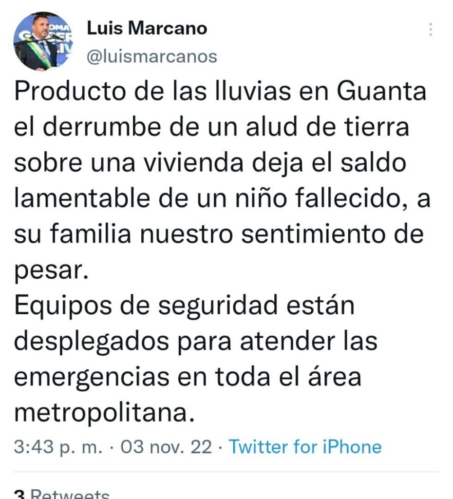 El gobernador del estado Anzoátegui, Luis Marcano, informó que las fuertes lluvias registradas en la entidad, sobre todo en la zona norte cobraron la vida de un niño fallecido.