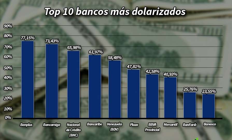 Banplus encabeza la lista con 77,15 % de sus depósitos en divisas. De un total de captaciones de 841,1 millones de bolívares, esta entidad cuenta con 648,9 millones en moneda extranjera, le sigue Bancamiga con 73,43 % de dolarización sobre unas captaciones totales de 1.350,7 millones de bolívares.