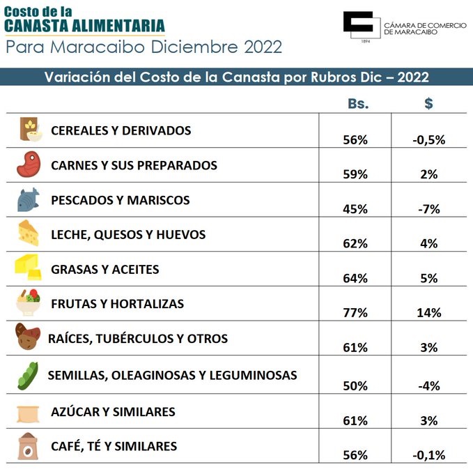 Los cálculos fueron realizados por la Unidad de Información y Estadísticas (UIE) del gremio que señala que «la Canasta Alimentaria Familiar de la ciudad de Maracaibo durante el mes de diciembre, se ubicó en Bs 8.876,00, cifra que evidenció un incremento de Bs 3.447,00 en comparación con noviembre».