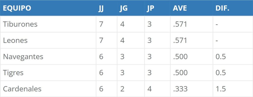 Tigres, que inició la jornada como puntero, bajó al tercero para igualarse con Navegantes del Magallanes, los dos con registro de 3-3. En la cola queda Cardenales de Lara con balance de 2-4.