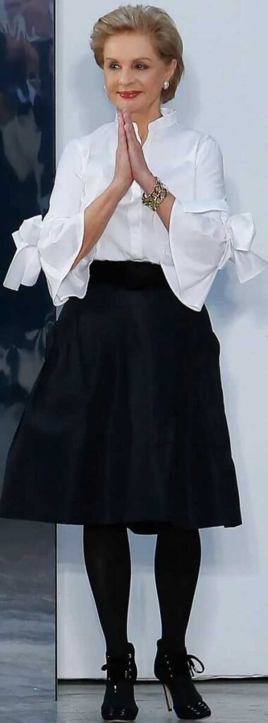 Carolina Herrera siempre indica que es necesario tener tres básicos en el armario, una camisa blanca, una falda midi y botines negros con cordones. Es la propuesta que siempre queda bien con todo y una de las más usadas para el armario de una mujer.