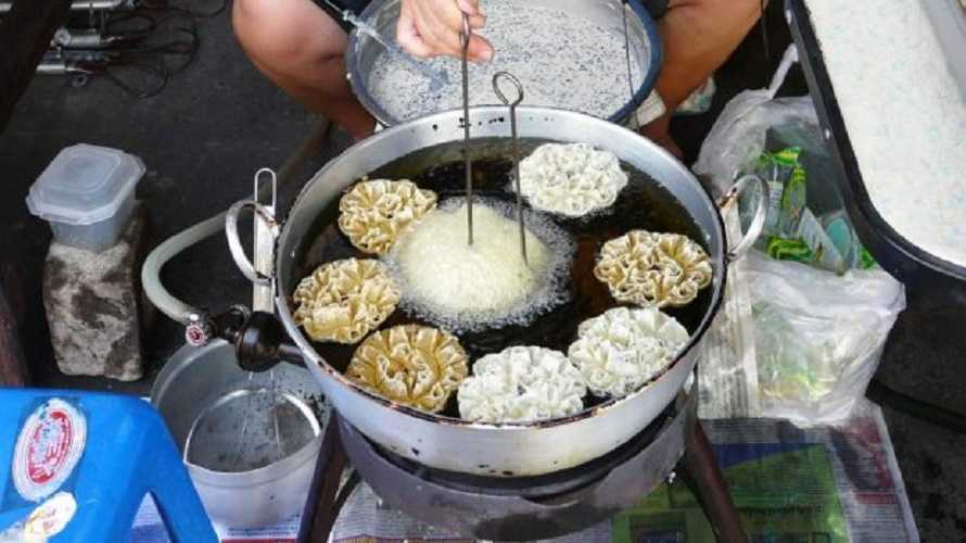 7-Introduce el molde con la masa en el aceite bien caliente y mueve suavemente para desprender la flor.