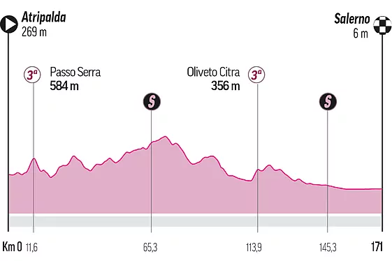 Jornada de 171 kilómetros entre Atripalda y Salerno en la que veremos una nueva lucha entre la fuga y los equipos de los sprinters en busca de la volata. Serán 2400 metros de desnivel que se concentrarán en la primera parte de la etapa.