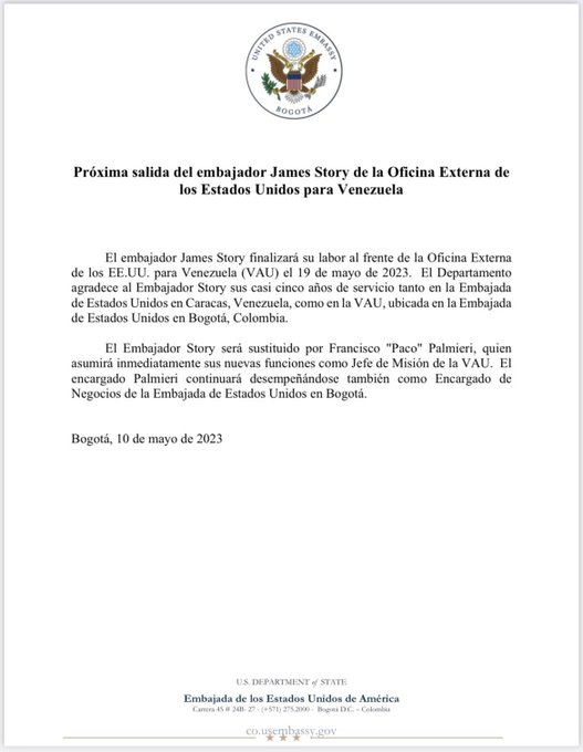 «Story finalizará su labor al frente de la Oficina Externa de los EEUU para Venezuela (VAU) el 19 de mayo de 2023 (…). Será sustituido por Francisco ‘Paco’ Palmieri, quien asumirá inmediatamente sus nuevas funciones como Jefe de Misión de la VAU», según un comunicado.