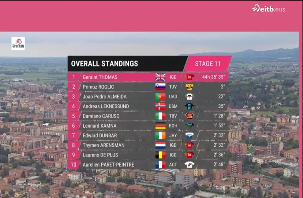 Geraint Thomas sigue líder a dos segundos de Roglic y Joao Almeida es tercero a 22 segundos, cuarta posición en la general para Andreas Leknessund a 35 segundos.