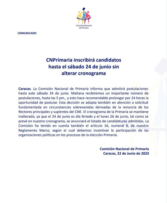 La Comisión Nacional de Primarias informó este jueves que fue prorrogado el lapso para que los candidatos se inscriban en el proceso se postulen.