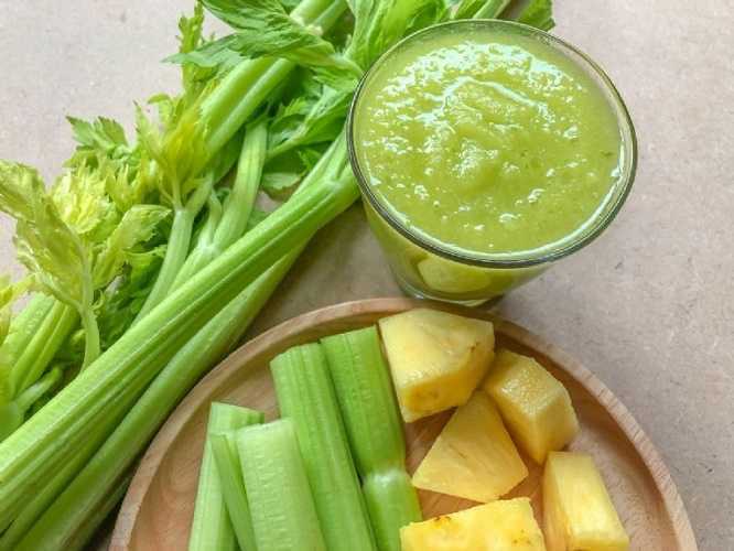2-Licua la piña, el pepino, el perejil, el apio, el jengibre, el jugo del limón y la manzana verde con el agua hasta conseguir una mezcla homogénea, sirve y toma.