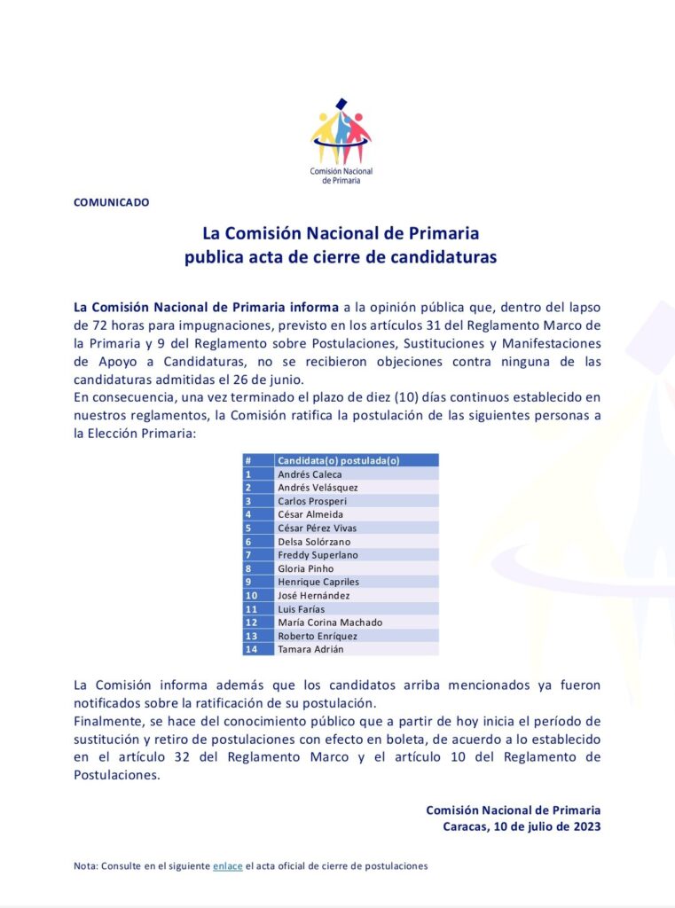 A través de un comunicado, la Comisión Nacional de Primaria ratificó este lunes a los 14 candidatos inscritos para la contienda, entre ellos María Corina Machado, Henrique Capriles Radonski y Freddy Superlano, a pesar de que están inhabilitados.