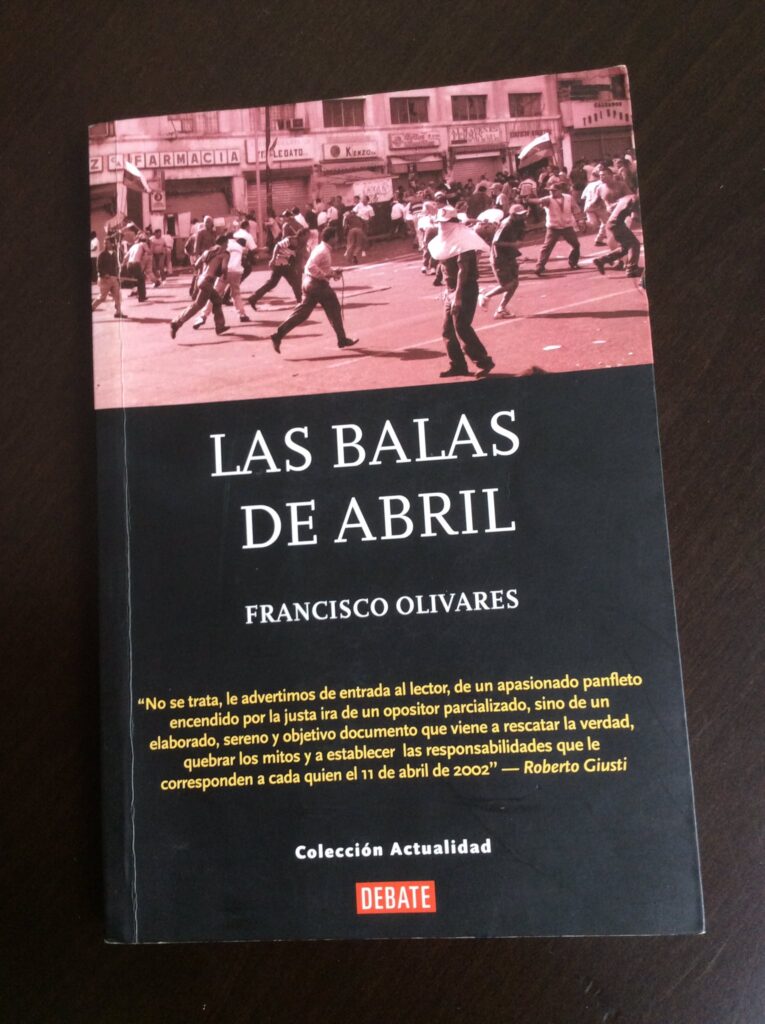 Francisco Olivares, (autor de «Los últimos días de Hugo Chávez», de «Afiuni, la presa del comandante»), periodista e investigador de la vida política venezolana reúne en su libro «Las balas de abril» los materiales de una larga, valiente y tenaz Investigación que ha terminado por revelar lo que realmente ocurrió el once de abril. Desmonta con nombres y apellidos la más aviesa y perversa operación del régimen chavista que convirtió una manifestación civil y desarmada en una conspiración, un golpe de estado y un inventado magnicidio, en pocas palabras, ¡sacar a Chávez del poder!