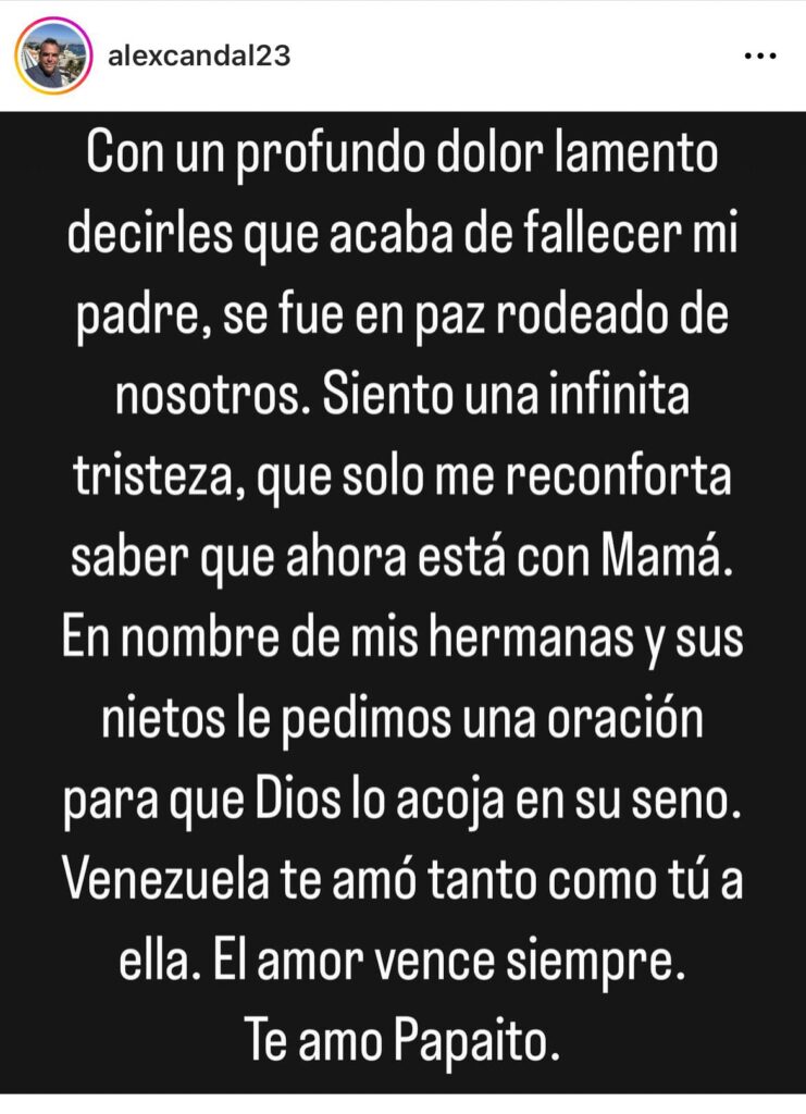 «Con un profundo dolor, lamento decirles que acaba de fallecer mi padre, se fue en paz rodeado de nosotros. Siento una infinita tristeza, que solo me reconforta saber que ahora está con mamá», relató Alex Candal en su cuenta en Instagram.