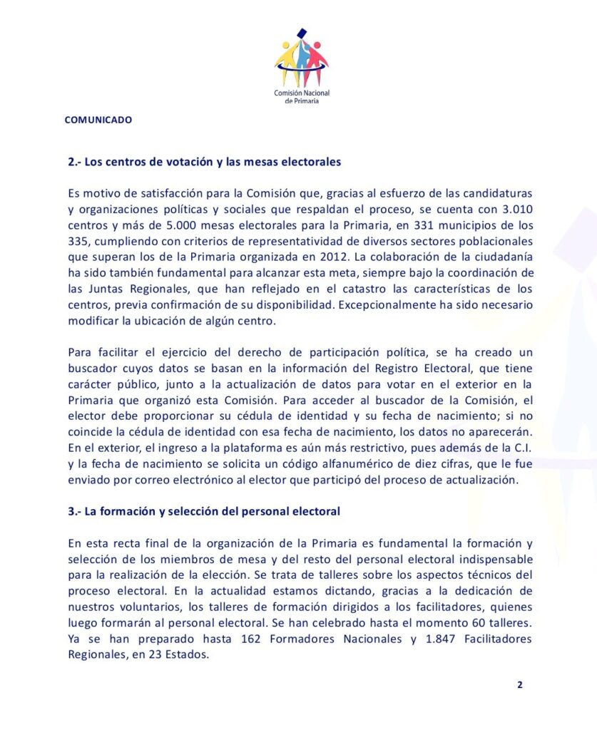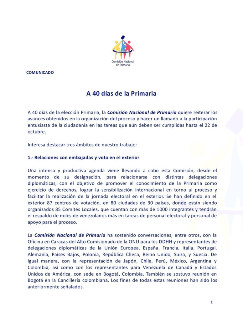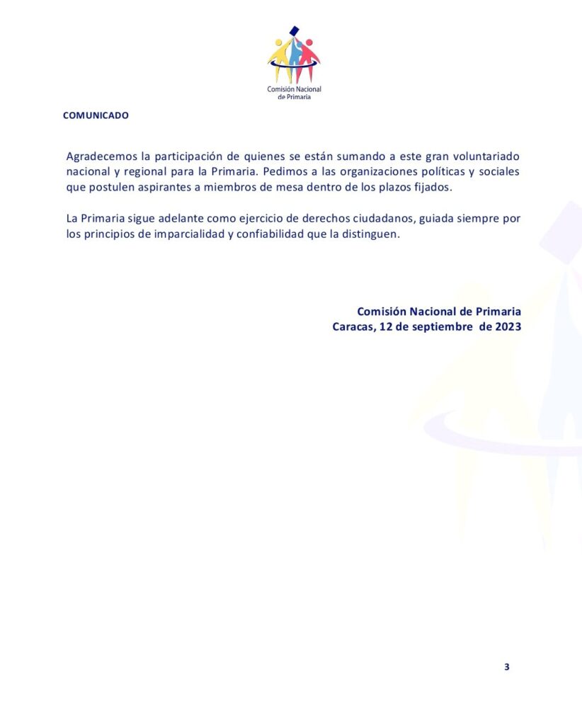 COMUNICADO Comisión Nacional de Primaria a 40 días de la Primaria pic.twitter.com/HATNgzu4hC— Comisión Nacional de Primaria VE (@cnprimariave) September 12, 2023