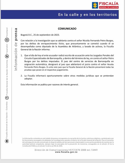 La Fiscalía colombiana presentó este lunes una acusación por enriquecimiento ilícito y lavado de activos contra Nicolás Petro Burgos, hijo del presidente Gustavo Petro, por lo que el hijo del mandatario irá a juicio.