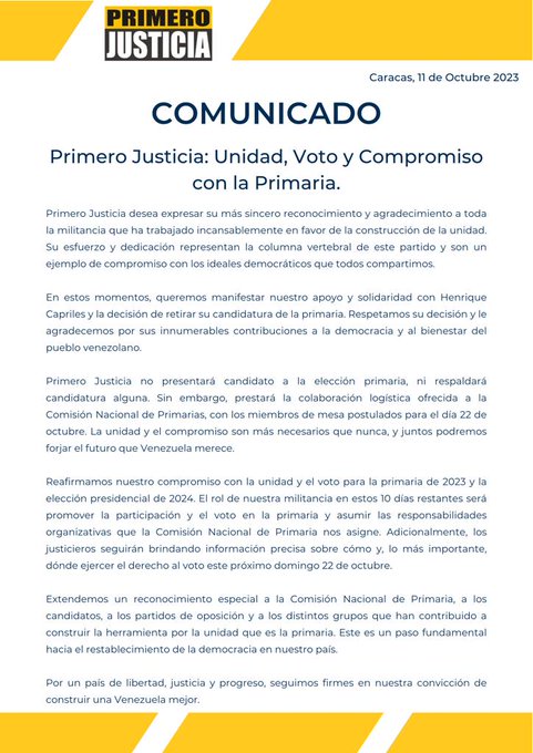 Pronunciamiento de Primero Justicia respecto a la Primaria del 22 de octubre del 2023, luego de Comité Político Nacional #11Oct pic.twitter.com/ortjPoP1yC— Primero Justicia (@Pr1meroJusticia) October 12, 2023