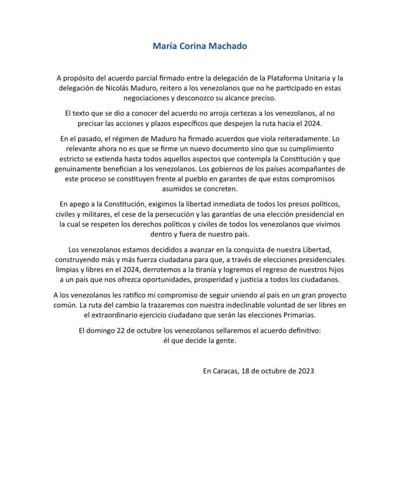 A los venezolanos y a la comunidad internacional: pic.twitter.com/R2RN5fRzfB— María Corina Machado (@MariaCorinaYA) October 18, 2023