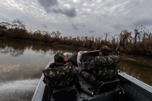 La unidad ambiental recorre en lancha rápida el río Miranda con una misión: encontrar animales heridos para su rescate en el Parque Estatal Pantanal do Rio Negro, donde se sospecha que se originó un incendio de grandes proporciones, inflamado por las altas temperaturas y las fuertes rachas de viento.