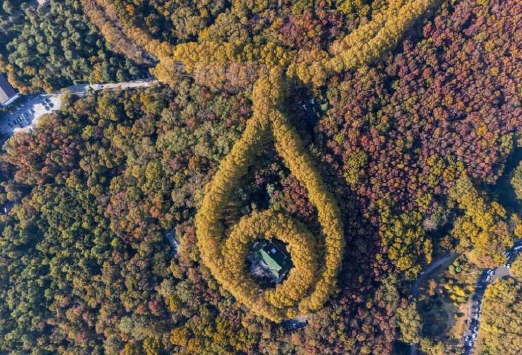 El Palacio Mei-ling, en el Parque Nacional de la Montaña Zhongshan en Nanjing, muestra una particularidad cuando se le mira desde arriba: la casa se asemeja a una esmeralda -con su tejado brillante- y los árboles a su alrededor, el collar que la envuelve. Armonía arbórea.