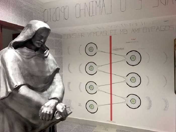 Además de los símbolos y el lenguaje desconocido inscrito en las paredes, la habitación contenía una estatua del científico Giordano Bruno, quien fue un astrónomo y matemático condenado a muerte en 1600 por sus ideas del espacio y la vida fuera de la Tierra. Sumado a eso había una pintura del joven Bruno con un ser extraterrestre a su lado.