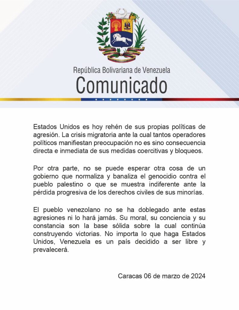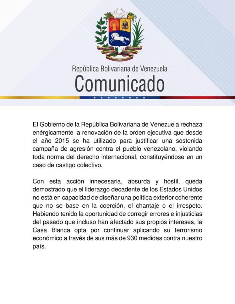 La mañana de este miércoles, el canciller Iván Gil emitió un comunicado en el cual rechaza la medida y acusa a Estados Unidos de no ser capaz de diseñar una política exterior coherente que no se base en la coerción y el chantaje.