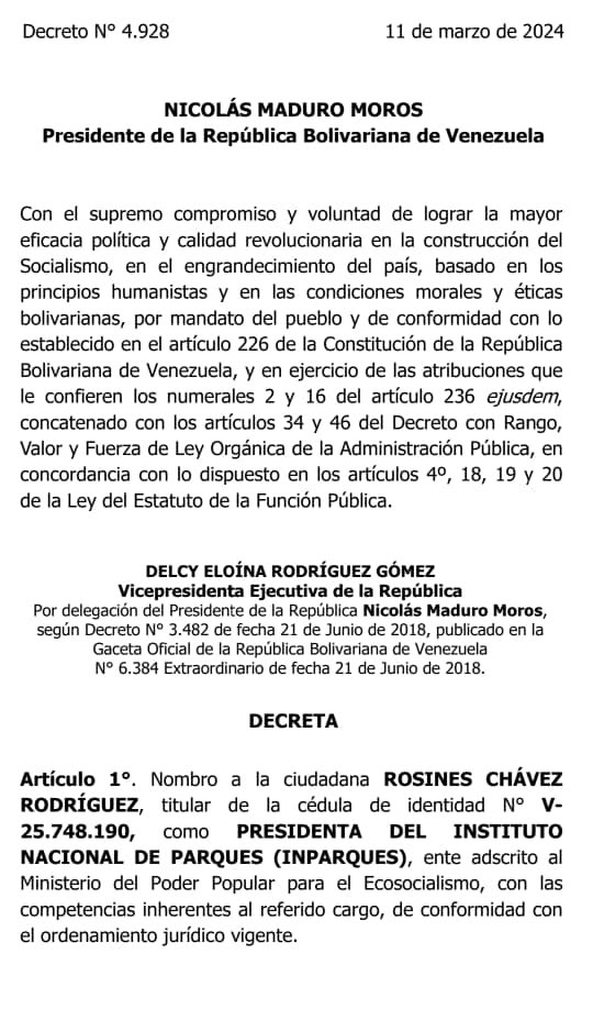 A través del decreto 4.928, emitido por el presidente Nicolás Maduro, se supo que Rosinés Chávez Rodríguez, hija del fallecido Hugo Chávez, fue designada presidenta del Instituto Nacional de Parques (Inparques).