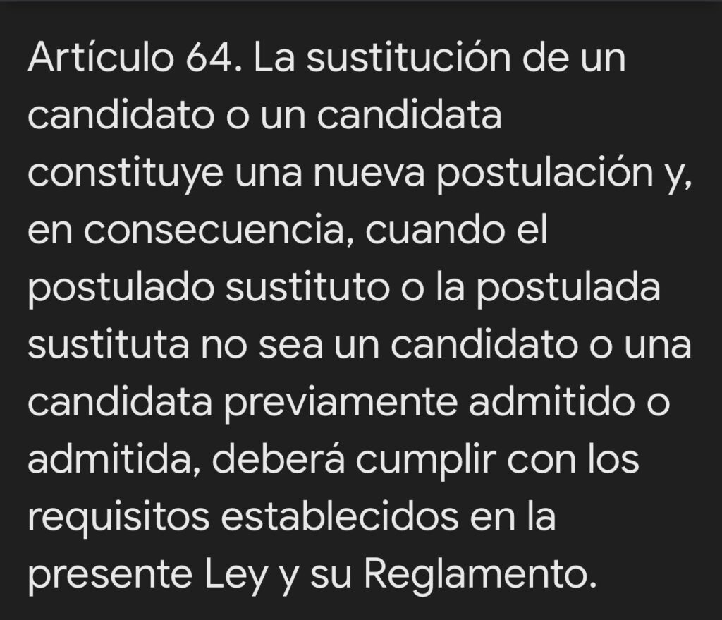 El señor Alberto, y la organización que lo sustituye, entienden que al no ser.alguno de los candidatos postulados y admitidos en la oportunidad inicial, a tenor del Artículo 64, esa sustitución constituye una nueva postulación y por tal razón debe cumplir los requisitos de ley y su reglamento.