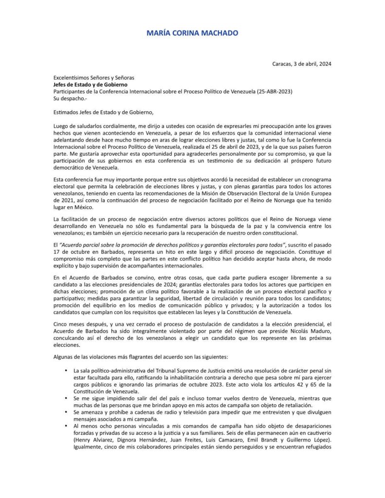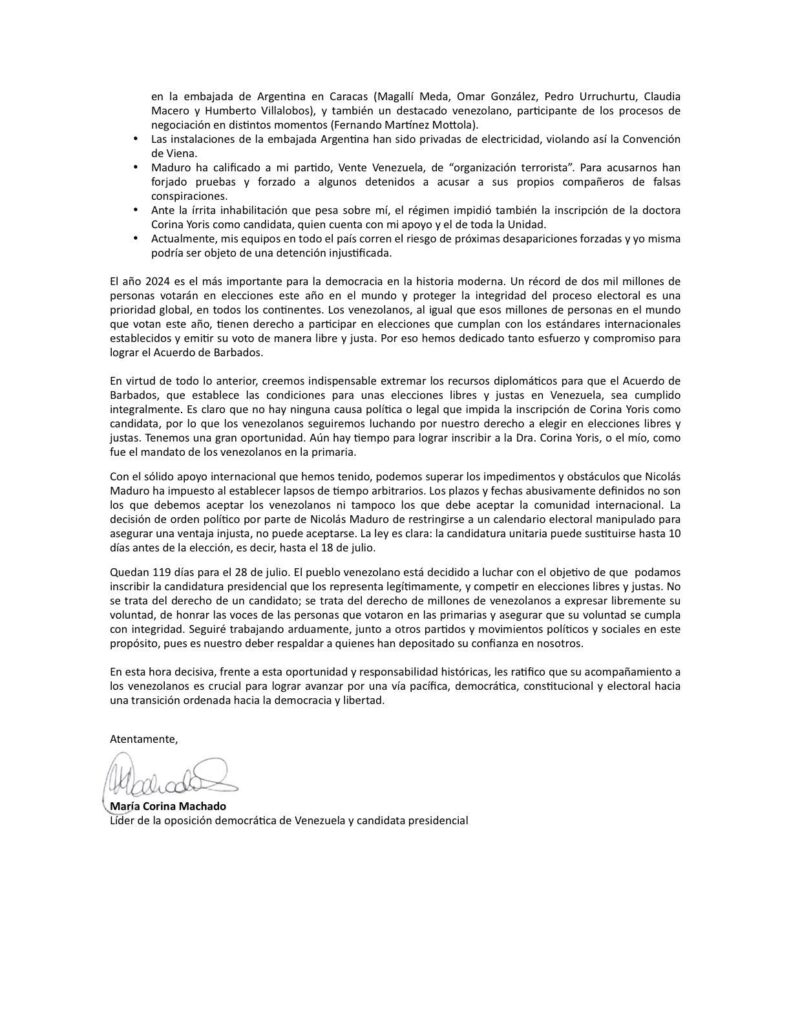 La advertencia la hizo al dirigente de Vente Venezuela, María Corina Machado, en una carta pública difundida a través de sus redes sociales y dirigida a 18 países de América, Europa y África, así como al canciller de la Unión Europea (UE), Josep Borrell.