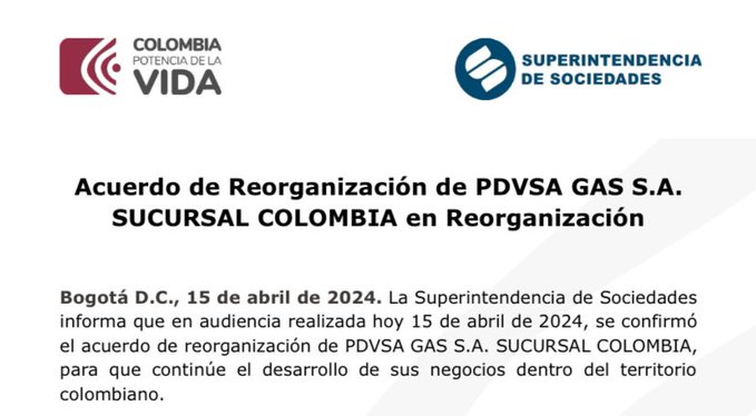 La información añadió que PDVSA GAS S.A. Sucursal Colombia inició su proceso recuperatorio en noviembre de 2022, y mediante la celebración de un acuerdo de reorganización aprobado por el 88% de sus acreedores, logró refinanciar un pasivo de más de 30.000 millones de pesos (unos 7,8 millones de dólares/7,3 millones de euros), el que se espera «se atienda de manera oportuna en un término inferior a dos años contados a partir del día de hoy».