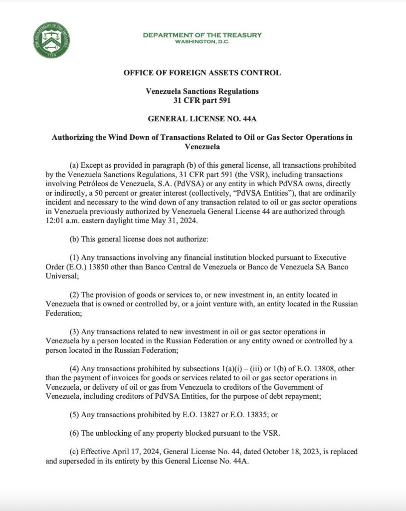 Apenas unas horas antes de la fecha límite, el Departamento del Tesoro de Estados Unidos anunció en su sitio web que había emitido una licencia de reemplazo que otorgaba a las empresas 45 días para «cerrar» sus negocios y transacciones en el sector de petróleo y gas en Venezuela, informó la agencia Reuters.