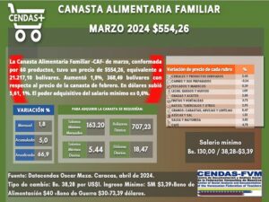 El Centro de Documentación y Análisis de la Federación Venezolana de Maestros (Cendas-FVM), informó que la Canasta Alimentaria Familiar de marzo, se ubicó en 554,26 dólares, lo que equivale a más de 21.000 bolívares, es decir que se necesitan más de 150 salarios mínimos para que una familia pueda correr con este gasto.
