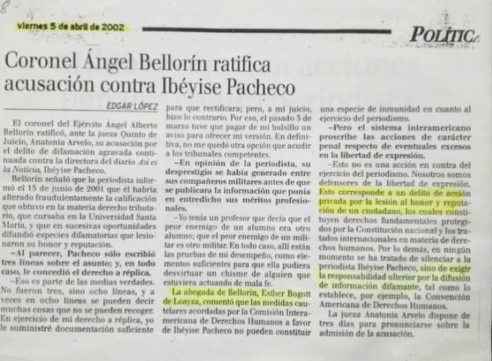 Considerando que el arbitrio del derecho de expresión, de opinión y de ejercicio profesional de la periodista, sumado a la cayapa mediática a su favor, había traspasado y lesionado mi derecho al honor y reputación, el 02 de Abril del año 2002 interpuse acusación penal por difamación agravada y continuada, para exigir que la justicia penal estableciera la verdad y se actuara de acuerdo a la aplicación del derecho.