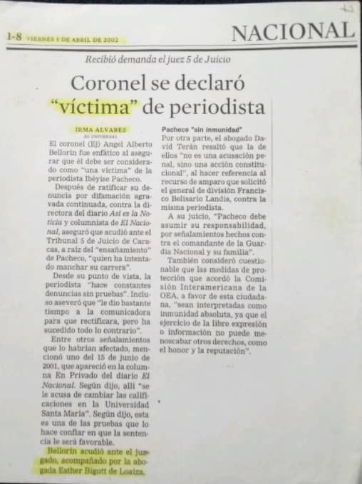 Título original: LA PERIODISTA ESTRELLA Y LAS ESTRELLAS DEL CORONEL: HISTORIA DE UN JUICIO INÚTIL. Por Ángel Alberto Bellorín (6ta. entrega).