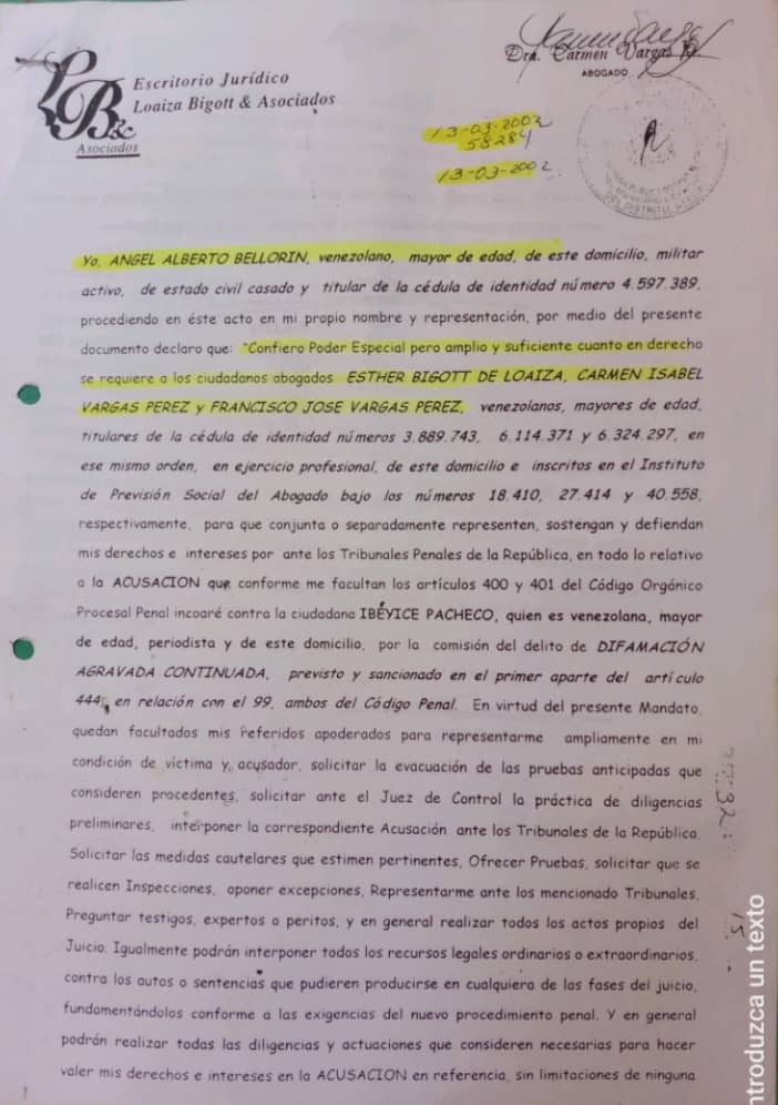 Al respecto, es necesario ver y comparar fechas para entender la temeridad y falsedad de las descalificaciones en contra de Esther Bigott. Le otorgué un poder notariado el 13 de Marzo del 2002 y cumpliendo su palabra me acompañó en ese primer juicio hasta que la sentencia quedó firme en febrero del 2005.