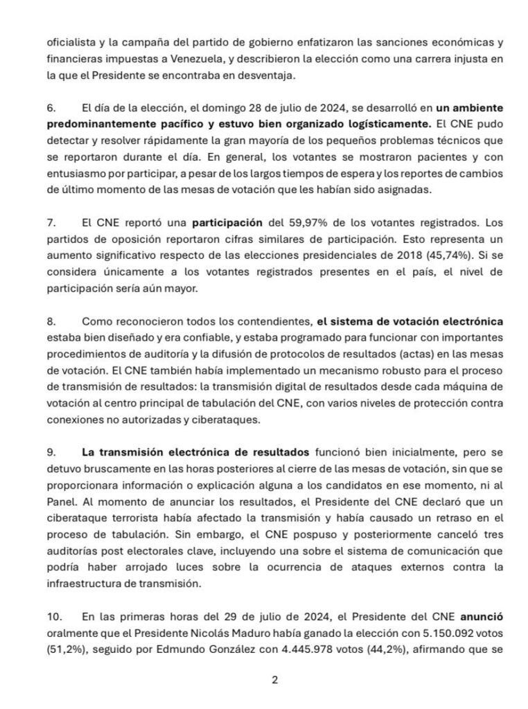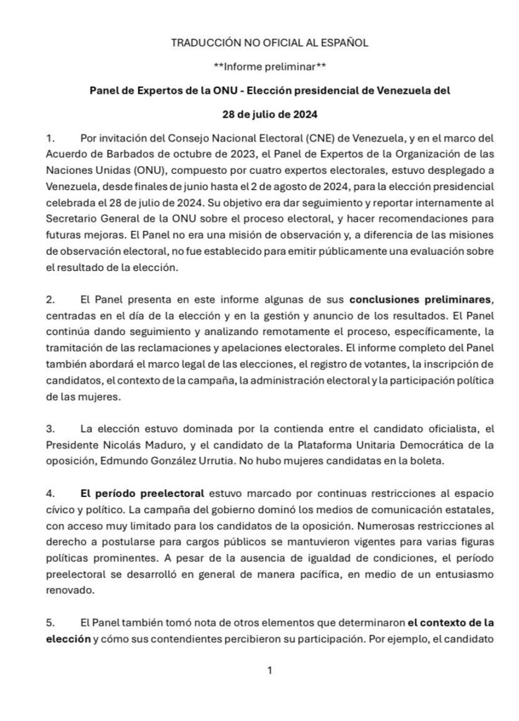 La noche de este martes, el Panel de Expertos Electorales ONU, publicó las conclusiones preliminares del proceso electoral del 28 de julio, en su calidad de observadores.