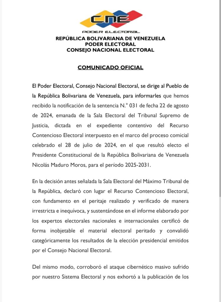 «El Poder Electoral en cumplimiento de la Constitución, la Ley Orgánica del TSJ y las normas electorales, acata la decisión y en el lapso de ley cumplirá con lo ordenado por la Sala Electoral del Tribunal Supremo de Justicia”.