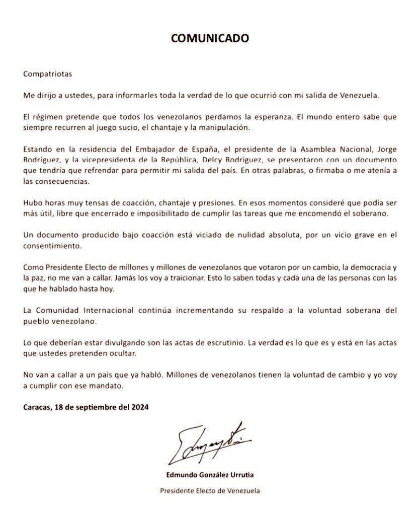 Desde el exilio en España, el dirigente opositor, Edmundo González Urrutia se defendió y argumentó las razones que tuvo para firmar la carta que salió a la luz pública, donde reconoce el fallo del TSJ sobre los resultados de las elecciones del 28 de julio que dan como ganador a Nicolás Maduro.