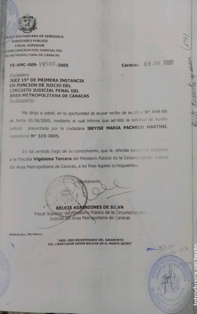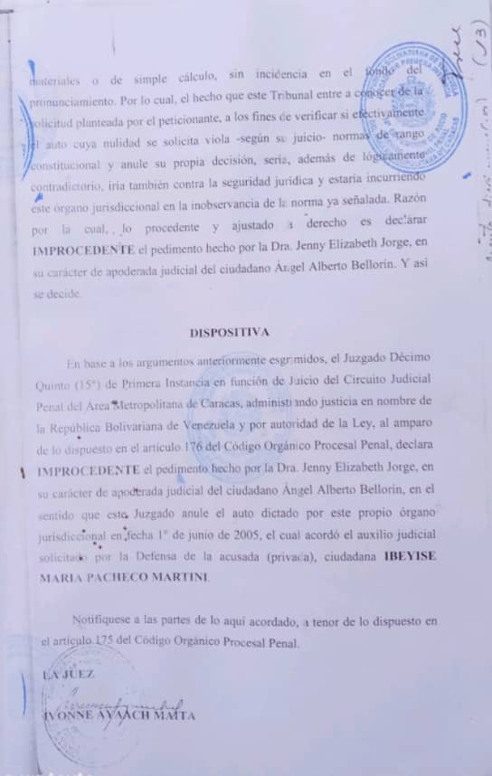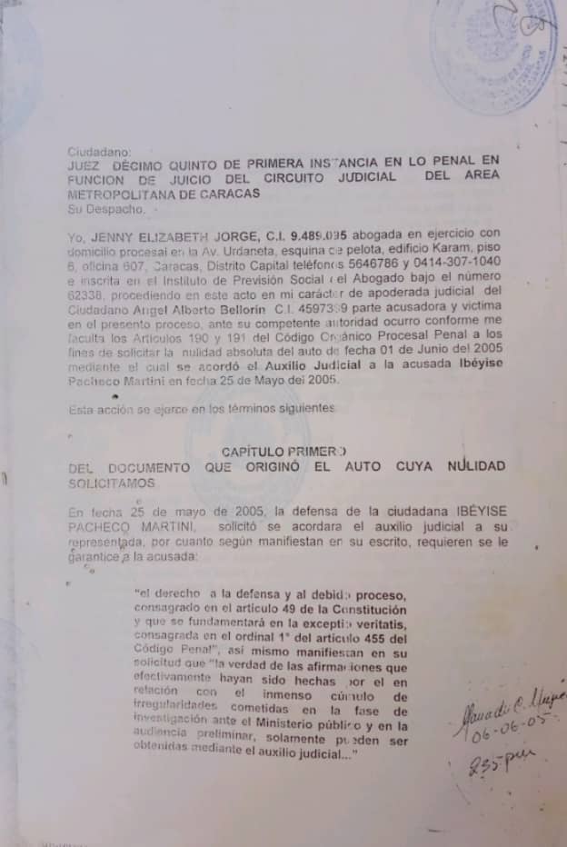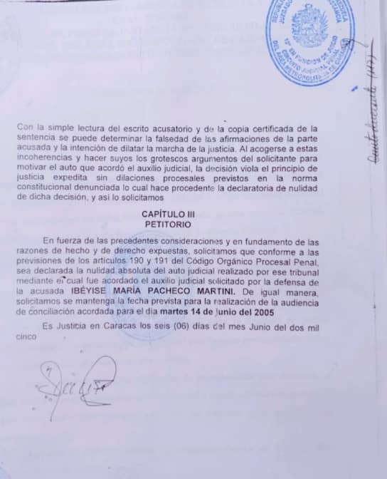 «En Fuerza de las precedentes consideraciones y en fundamento de las razones de hecho y de derecho expuestas, solicitamos que conforme a las previsiones de los artículos 190 y 191 del Código Orgánico Procesal Penal, sea declarada la nulidad absoluta del auto judicial realizado por ese tribunal mediante el cual fue acordado el auxilio judicial solicitado por la defensa de la acusada IBÉYICE MARÍA PACHECO MARTINI. De igual manera, solicitamos se mantenga la fecha prevista para la realización de la audiencia de conciliación acordada para el día martes 14 de junio de 2005. (Fin de la cita)
