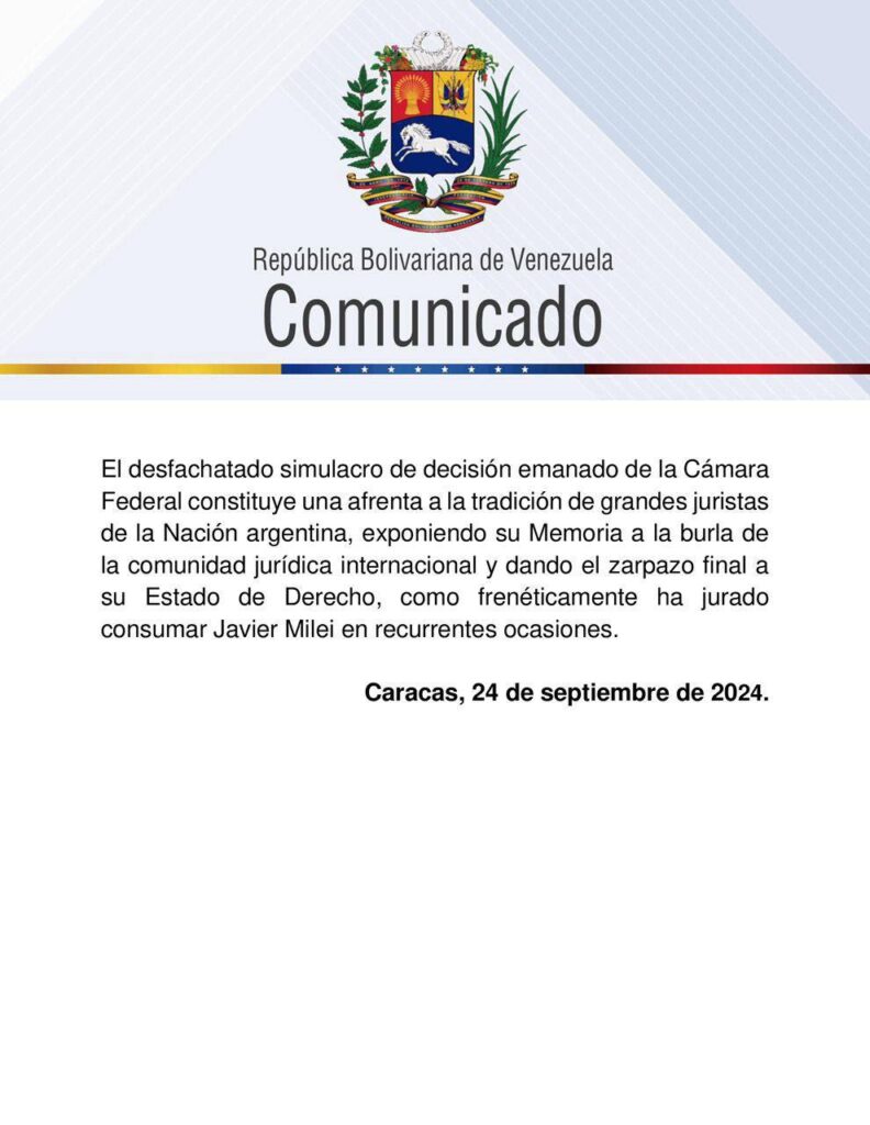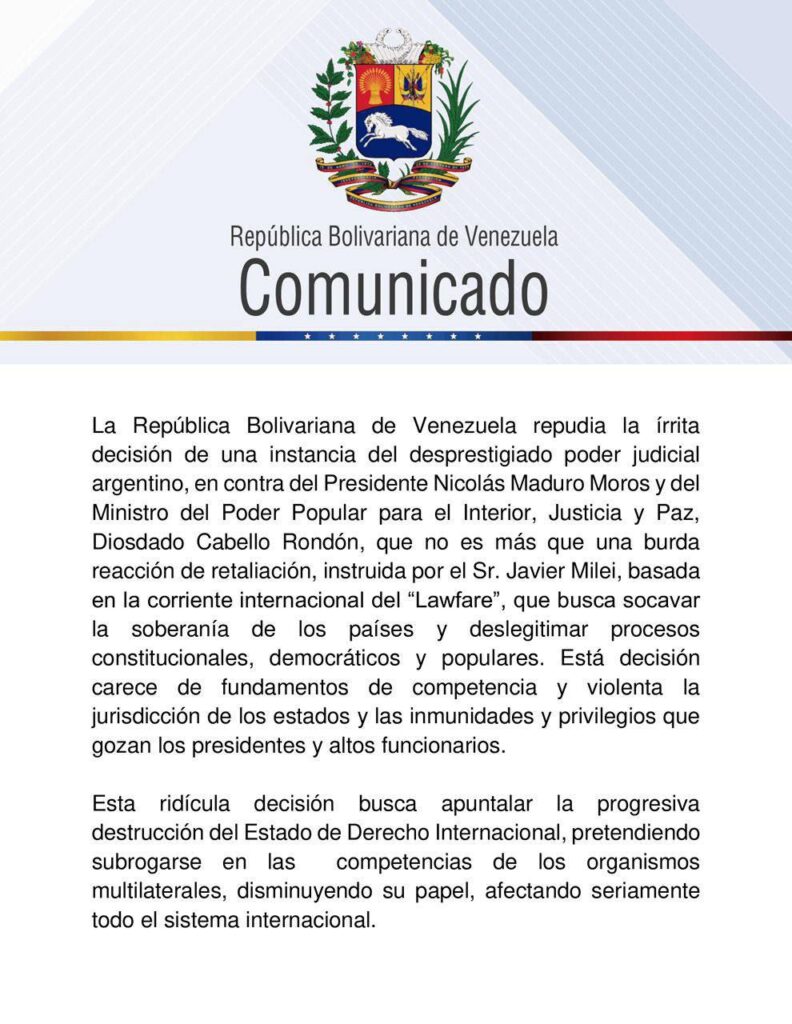 «La República Bolivariana de Venezuela repudia la írrita decisión de una instancia del desprestigiado poder judicial argentino, en contra del Presidente Nicolás Maduro Moros y del Ministro del Poder Popular para el Interior, Justicia y Paz, Diosdado Cabello Rondón», señala el escrito.