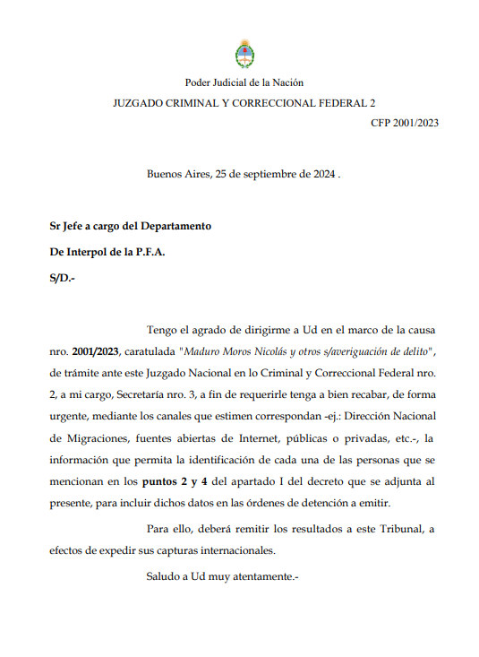 La justicia argentina formalizó este miércoles el petitorio de captura contra Nicolás Maduro Maduro, Diosdado Cabello y otros funcionarios del gobierno.