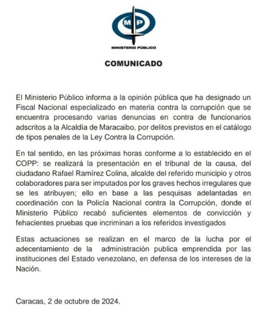 «En las próximas horas, conforme a lo establecido en el COPP, se realizará la presentación en el tribunal de la causa, del ciudadano Rafael Ramírez Colina, alcalde del referido municipio y otros colaboradores para ser imputados por los graves hechos irregulares que se les atribuyen», dice un comunicado del MP en su cuenta en Instagram.