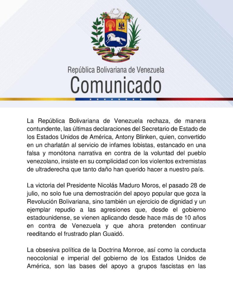 En un comunicado, el canciller Yván Gil enfatizó en que «la victoria del presidente Nicolás Maduro Moros, el pasado 28 de julio, no solo fue una demostración del apoyo popular que goza la Revolución Bolivariana, sino también un ejercicio de dignidad y un ejemplar repudio a las agresiones que, desde el gobierno estadounidense, se vienen aplicando desde hace más de 10 años en contra de Venezuela y que ahora pretenden continuar reeditando el frustrado plan Guaidó».