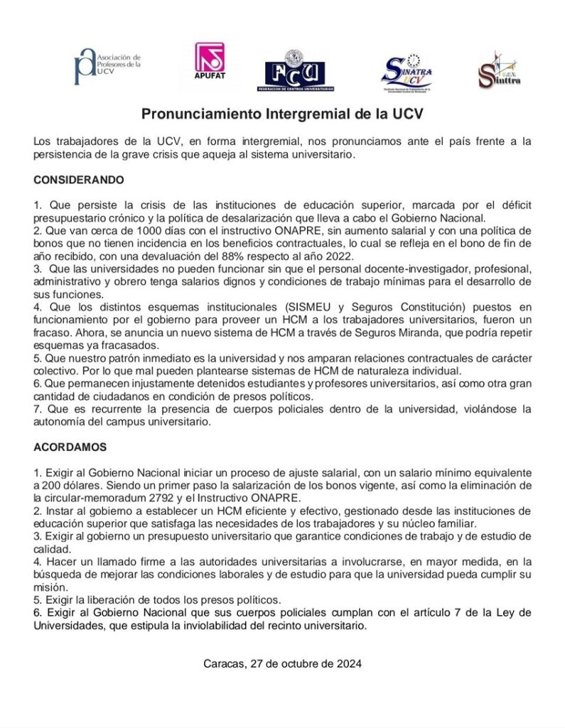 Diferentes gremios y sindicatos de la Universidad Central de Venezuela exigieron el Gobierno de Nicolás Maduro un ajuste salarial.