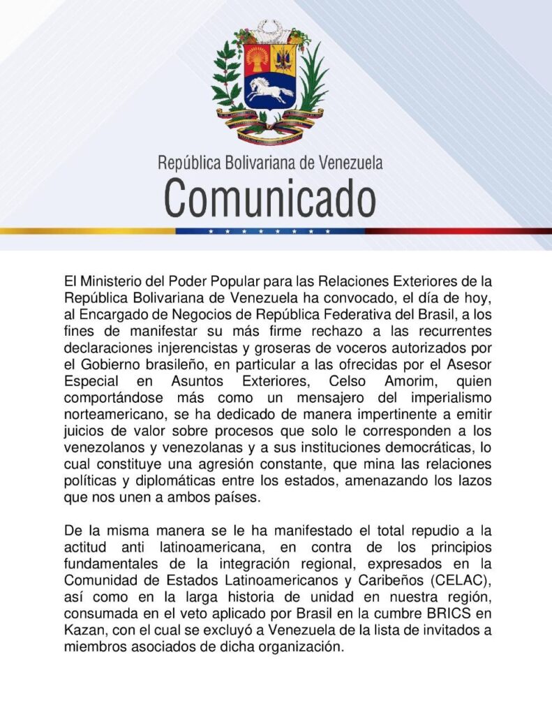 Más temprano, el presidente de la Asamblea Nacional, Jorge Rodríguez, anunció que pediría a la plenaria de la AN que declare «persona non grata» a Amorim, a quien acusó de ser agente de EE.UU.