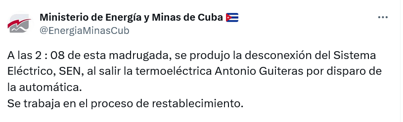 La empresa de energía agregó, sin brindar mayores precisiones, que la desconexión se debió a un “disparo de la automática de la CTE Antonio Guiteras de Matanzas”. Además, aseguró que se está trabajando en el “proceso de restablecimiento”.