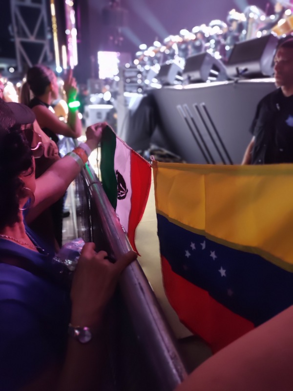 Al hacer nuevamente su recorrido en escenario, Micky ya había visto a mi mami a mi lado con sus banderas en la mano. Y es que se convirtió en tradición que Lily tenga las banderas de México y Venezuela en las manos.