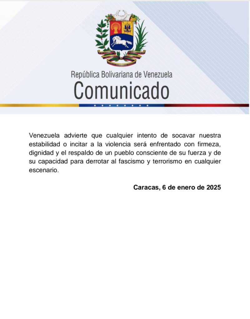 Venezuela advierte que «cualquier intento de socavar la estabilidad o incitar a la violencia será enfrentado con firmeza, dignidad y el respaldo de un pueblo consciente de su fuerza y de su capacidad para derrotar el fascismo y el terrorismo».