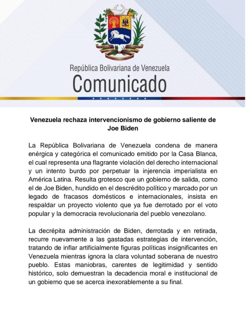«Resulta grotesco que un gobierno de salida, como el de Joe Biden, hundido en el descrédito político y marcado por un legado de fracasos domésticos e internacionales, insista en respaldar un proyecto violento que ya fue derrotado por el voto popular y la democracia revolucionaria del pueblo venezolano», dice el escrito.