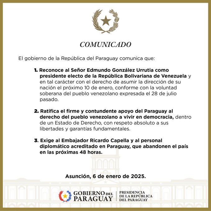 Poco tiempo después de que la cancillería emitiera un comunicado anunciando la ruptura de relaciones con Paraguay, el gobierno del presidente Santiago Peña respondió y dio 48 horas al embajador de Venezuela, Ricardo Capella, para abandonar el país, así como todo el personal diplomático acreditado.